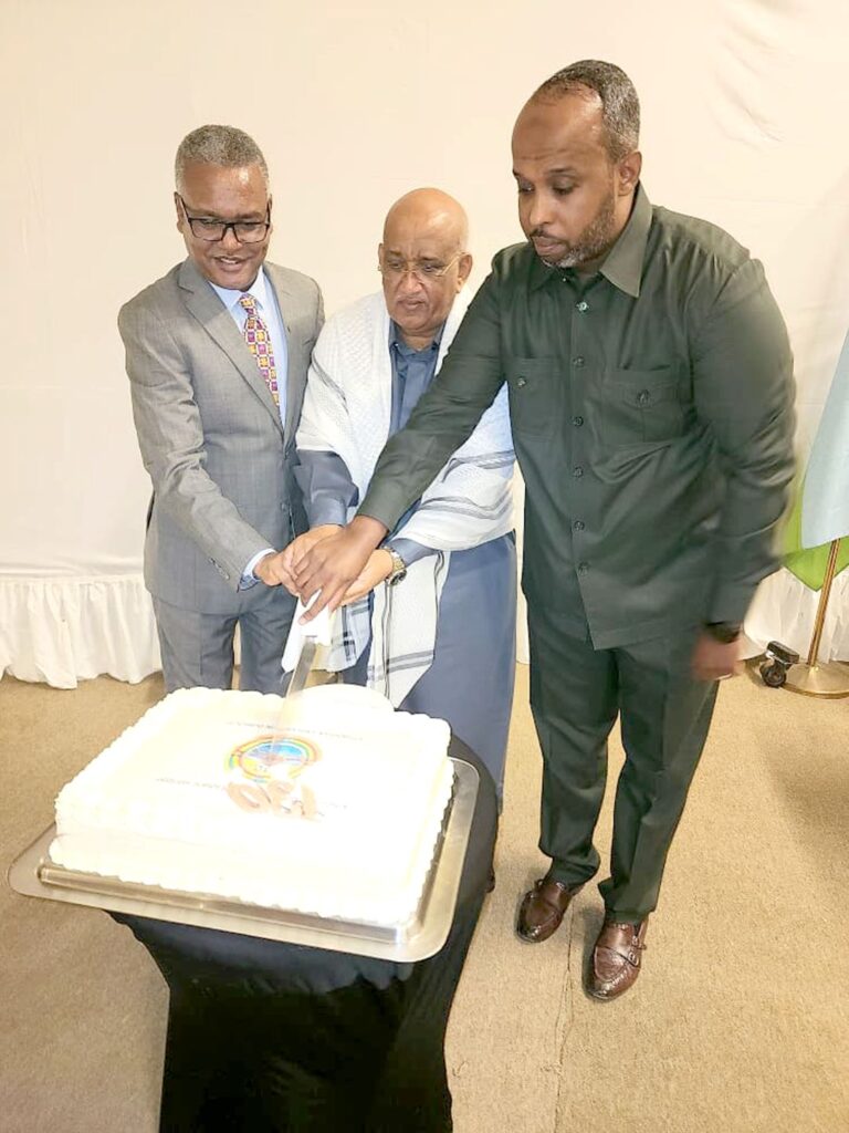 A l’issue de la cérémonie l’ambassadeur Legesse Tulu, le président de l’Assemblée nationale Dileita Mohamed Dileita et le directeur du département des relations bilatérales du MAECI, Mahdi Absieh Bouh, ont ensemble procédé à couper le gâteau marquant le 130ᵉ anniversaire de la victoire éthiopienne contre l’armée italienne coloniale mais également 130 ans de relations diplomatiques entre Djibouti et l’Ethiopie.