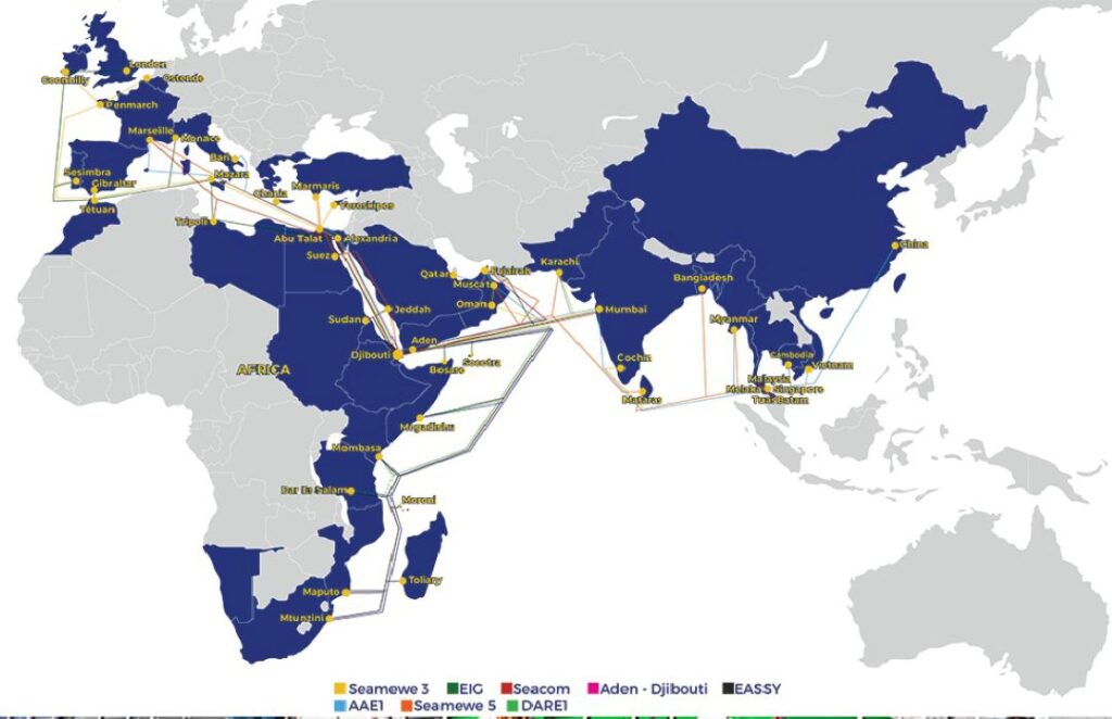 – Parti de Djibouti et déjà connecté au Kenya, ce câble va désormais s’étendre vers le sud, jusqu’à l’Afrique du Sud.