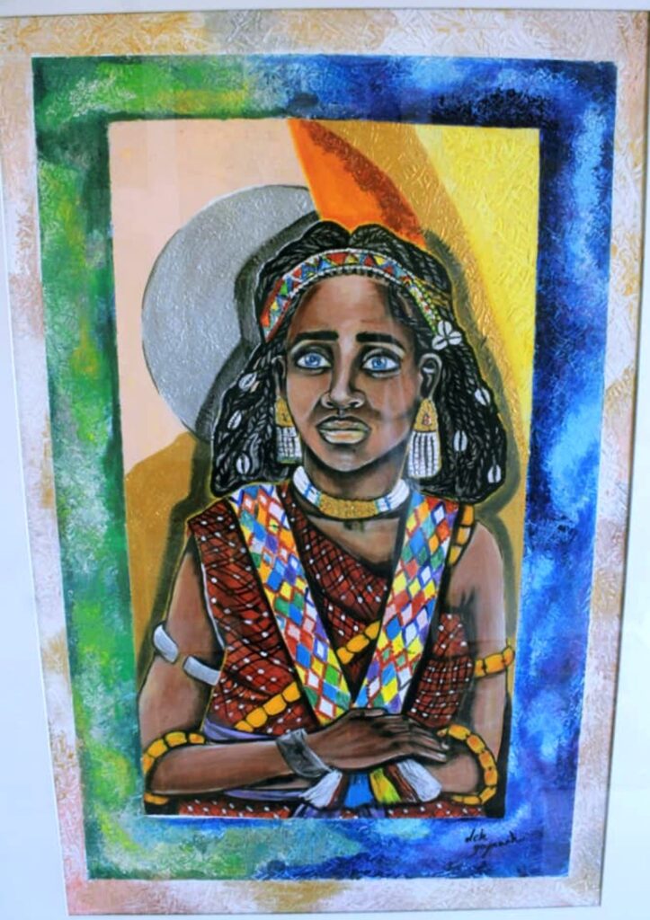 L’art agit ici comme un langage commun, sans besoin de traduction. Plus loin, des invités discutent entre deux tableaux. On sent que la galerie n’est pas seulement un lieu de contemplation, mais aussi un espace de rencontre. Les artistes, les amateurs d’art, les curieux et les passionnés s’y croisent naturellement. On y vient pour voir, mais aussi pour ressentir. L’une des singularités de Gaffaneh réside dans sa capacité à faire dialoguer tradition et modernité. Certaines œuvres représentent des femmes djiboutiennes dans toute leur élégance : posture droite, regard assuré, vêtements traditionnels revisités par une touche contemporaine. Les bijoux, les étoffes, les expressions du visage deviennent autant de symboles d’une identité forte.