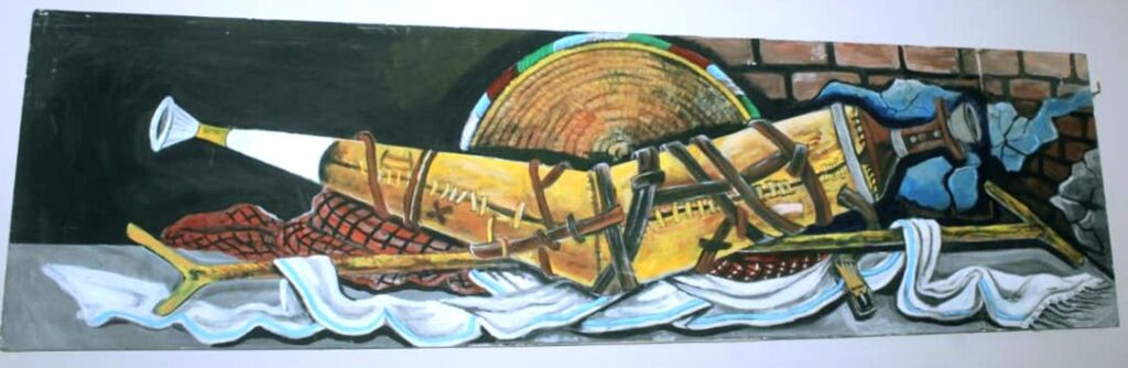 Mais ce qui frappe avant tout, ce sont les toiles. Certaines explosent de couleurs vives, presque solaires. D’autres jouent davantage sur la profondeur des regards et la subtilité des gestes. Une grande peinture attire particulièrement l’attention : on y voit plusieurs figures africaines, vêtues de tissus traditionnels, dans une scène qui semble à la fois historique et symbolique. Une femme debout, drapée dans des tons rouges et orangés, regarde l’horizon avec fierté.