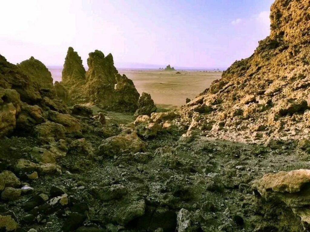 De cet effondrement est née une dépression parcourue de fractures profondes, à travers lesquelles ont émergé des sources chaudes fortement chargées en calcium. En se mélangeant à l’eau froide du lac, ces sources ont formé, au fil des millénaires, des concrétions calcaires – les fameuses cheminées hydrothermales – dont certaines culminent aujourd’hui à plus de 50 mètres de haut. La plus imposante d’entre elles, connue sous le nom d’As Bahalto, atteint près de 60 mètres de hauteur pour 90 mètres de diamètre. Certaines de ces structures présentent une texture stromatolithique, rappelant des formations similaires retrouvées… au fond des océans.