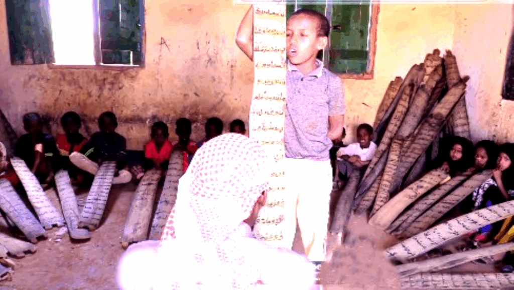 Imaginons une journée typique dans un école coranique djiboutienne du milieu du XIXe siècle, sous le soleil ardent. Les garçons se réunissent à l’aube, après la prière du Fajr, dans une cour poussiéreuse près d’une mosquée. Vêtus de simples tuniques, ils s’asseyent en cercle autour du maâlem, un homme barbu assis sur un tapis usé, un bâton en main pour corriger les fautes.
