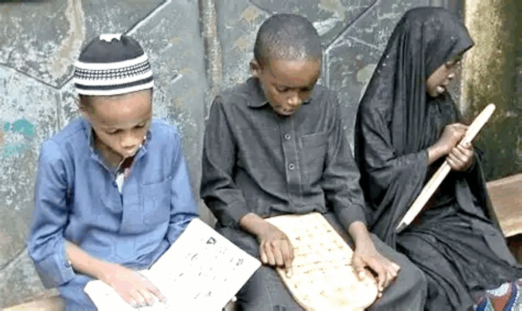 La matinée est dédiée à la récitation collective du Coran. Le maître récite un verset de la sourate Al-Fatiha ou d’une plus longue comme Al-Baqara, et les élèves répètent en chœur, leurs voix résonnant comme un écho rythmé. La mémorisation est au cœur : chaque enfant doit apprendre par cœur une portion quotidienne. Ceux qui trébuchent reçoivent un coup de bâton ou copient le verset sur l’ardoise en bois avec un roseau trempé dans de l’encre noir. Pas de livres pour tous ; le Coran est oral, gravé dans la mémoire.