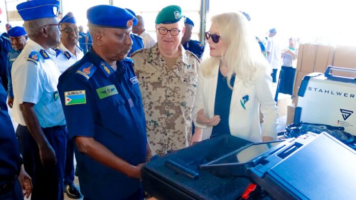 Sous le regard du Colonel Abdourahman Ali Kahin, Directeur Général de la Police Nationale, et de la délégation allemande conduite par S.E. Dr Heike Fuller, Ambassadrice d’Allemagne à Djibouti, la remise a porté sur des véhicules d’intervention et du matériel de maintenance de pointe. Étaient également présents le Colonel Jens Ludwig, Attaché de Défense, et le Capitaine Jan Christ, officier de liaison. Plusieurs officiers allemands et policiers djiboutiens ont assisté à cette journée.