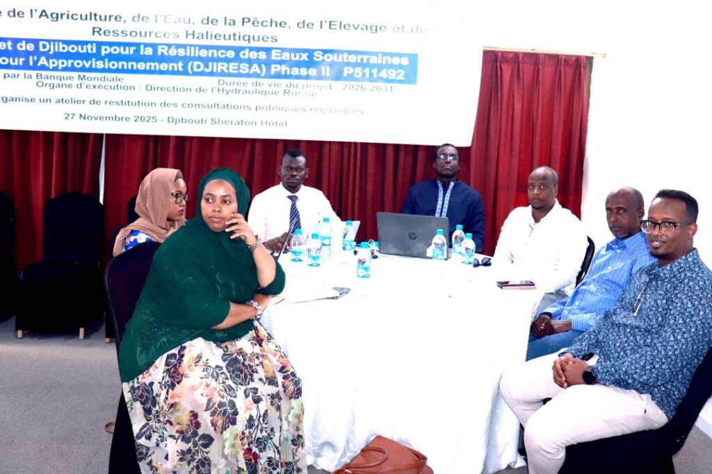 Dans le cadre de la préparation du Projet de Djibouti pour la résilience des eaux souterraines et l’approvisionnement (DJIRESA), le ministère de l’Agriculture, de l’Eau, de la Pêche, de l’Élevage et des Ressources halieutiques a organisé, jeudi 27 novembre 2025, un atelier final de restitution des consultations publiques régionales. La rencontre, tenue à l’hôtel Sheraton, a rassemblé les principaux acteurs du secteur de l’eau, marquant une nouvelle étape vers la construction d’un avenir plus résilient pour les communautés du pays.